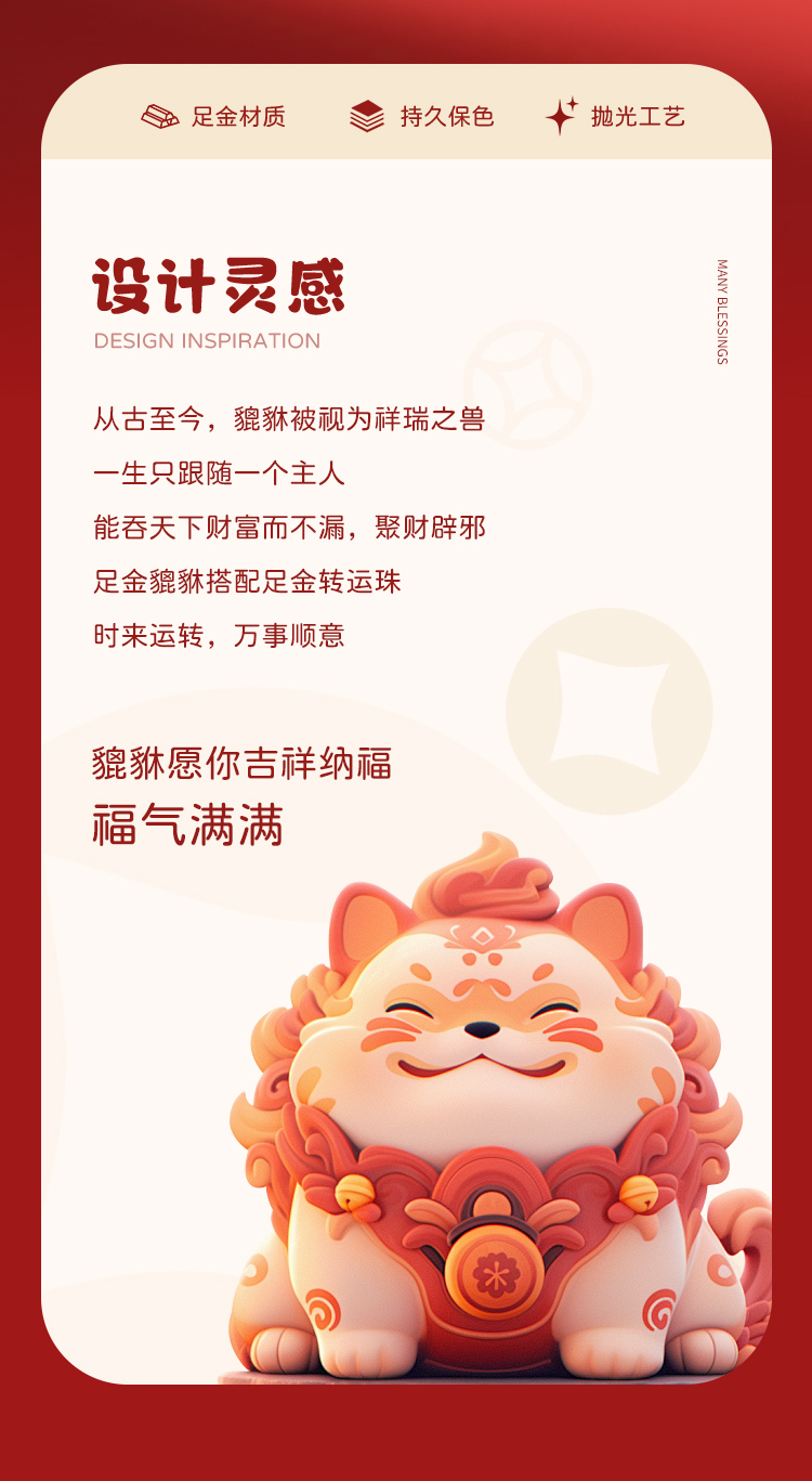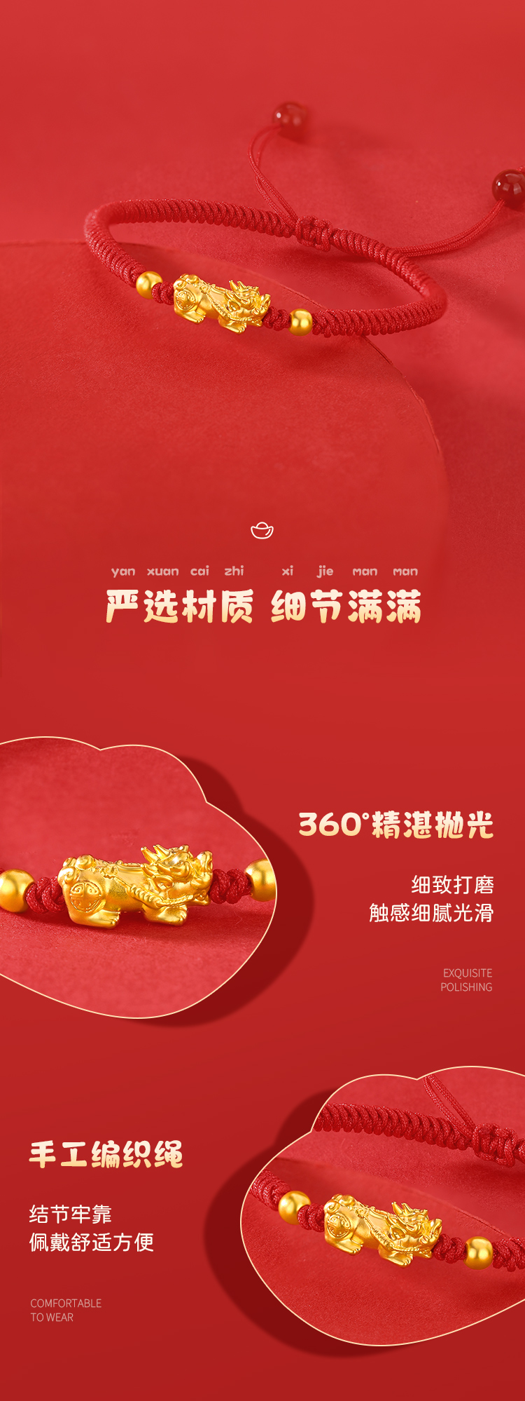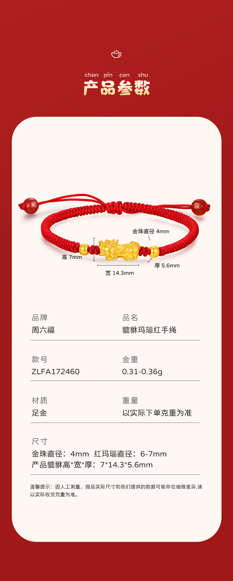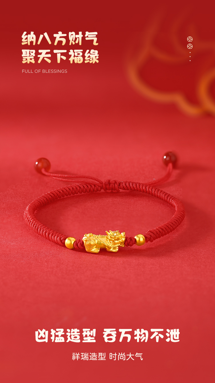 周六福足金招财貔貅玛瑙红手绳