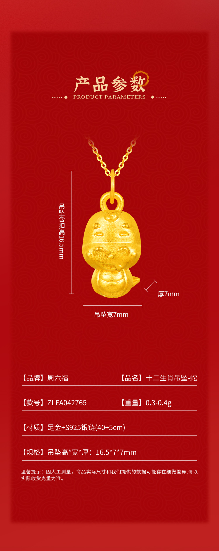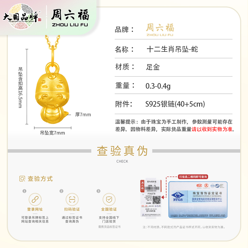 周六福足金十二生肖吊坠-蛇